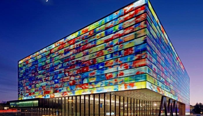 Institutul Olandez de Sunet si Imagine are forma unui cub si este construit jumatate in pamant. Cladirea este decorata cu geamuri colorate in sute de mii de nuante si este una dintre principalele atractii ale orasului Hilversum.