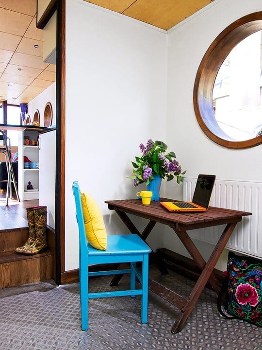 Si printre toate lucrurile ce inspira „dor de duca”, s-a strecurat si un mic birou unde Sebastian poate lucra in liniste. Este plasat intre living si dormitor, iar mobilierul, asa cum spun proprietarii, a fost reciclat in urma unui eveniment ce avea ca scop promovarea turistica a raului Vistula.