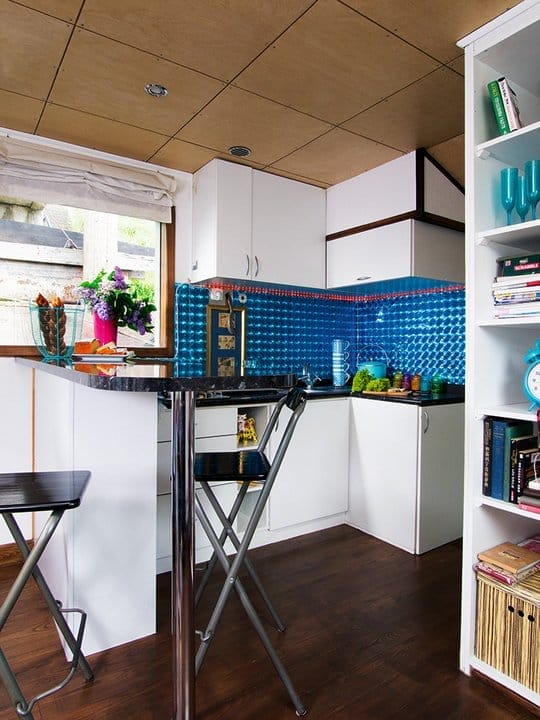 Bucataria este mascata de biblioteca si este destul de mica, dar contine tot ceea ce o familie ar avea nevoie: frigider, aragaz, apa calda, gaz. Proprietarii au renuntat la masina de spalat vase, atat de populara in bucatariile vestice, pentru a economisi energie electrica.