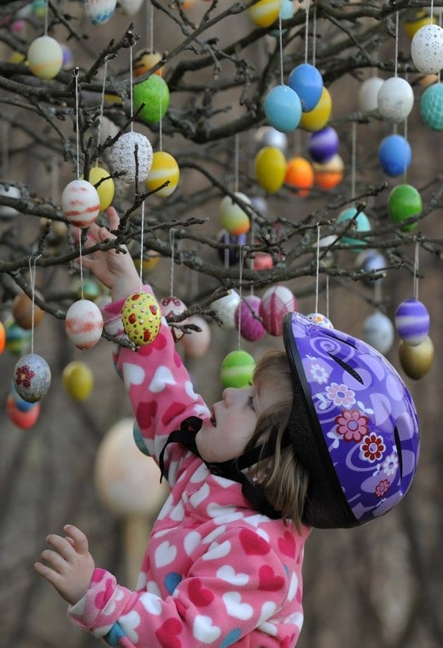 Un copacel banal din curte poate fi impodobit frumos cu globulete in forma de…ou. Copiii vor fi cu siguranta incantati.