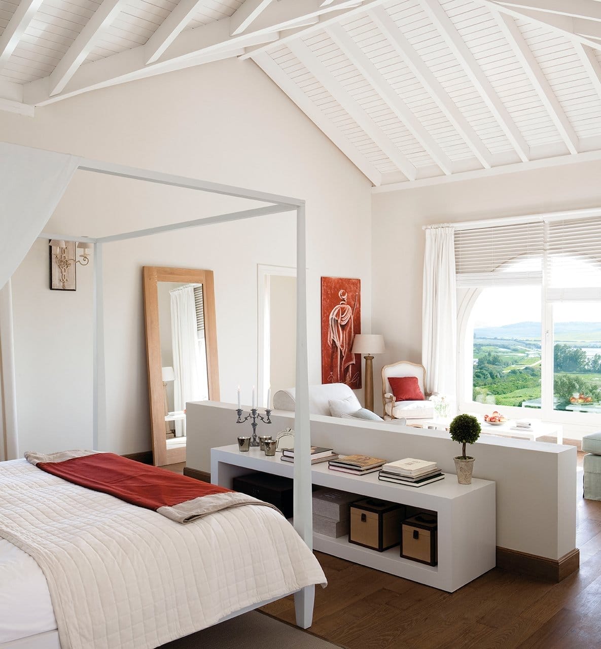 Pentru iubitorii de paradisuri terestre, probabil ca acest dormitor este formula ideala a implinirii, macar pentru cateva ore, a visului boem. Aproape toate elementele importante sunt albe, de la tavan, de fapt un acoperis frumos vopsit si incadrat, la pat, cuvertura si vopseaua de pe pereti. Si totusi, dormitorul nu are o alura bolnavicioasa, de la prea mult alb, datorita elementelor aramii – cuvertura, tablou, perna si oglinzi din lemn. Bineinteles, intregul cadru surprins este bine reliefat si de fundalul care se zareste pe fereastra, dar sunt convins ca nici intr-un spatiu citadin nu te-ai simti prost intr-un astfel de dormitor.