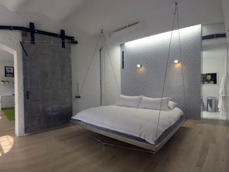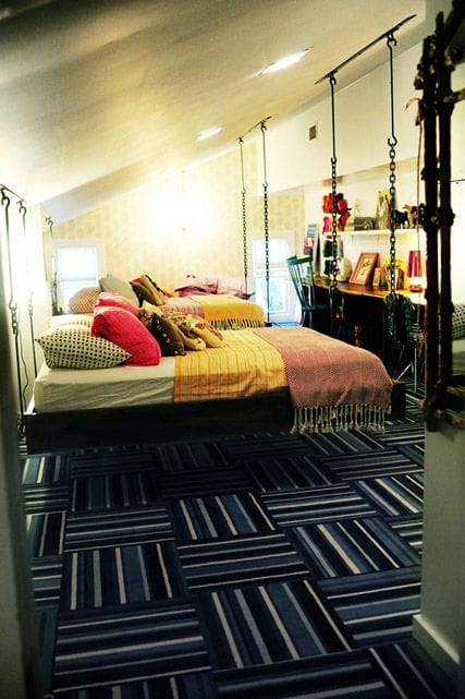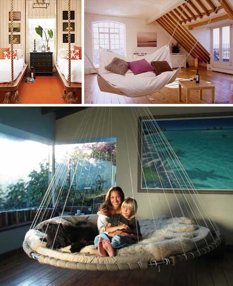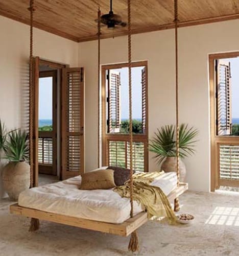 O alta varianta este cea de tip hamac, paturile suspendate de acest fel gasindu-se mai ales in resorturi si hoteluri si asociate cu ideea de relaxare. Poti sa instalezi un astfel de pat suspendat in terasa, mai ales daca ai una mare si daca iti place sa petreci timp acolo, sa simti vantul si sa auzi greierii, mai ales daca traiesti in afara orasului. In orice caz, daca vrei sa achizitionezi un pat suspendat de acest fel pentru amenajarea dormitoruluim asigura-te ca atmosfera generala are un aer mai „tropical” si aeresit, fara prea mutla mobila.