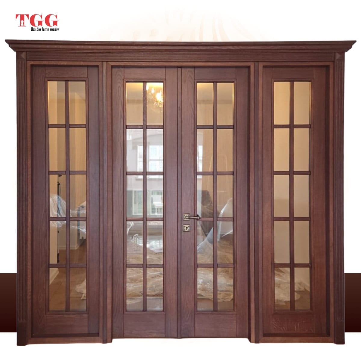 Ansablul 4K egale cu geam transparent reprezentat în imagine este din stejar masiv stratificat, finisaj stejar auriu cu pervaz capitel cu cornisa clasic . Model expus cota L230/H255cm.