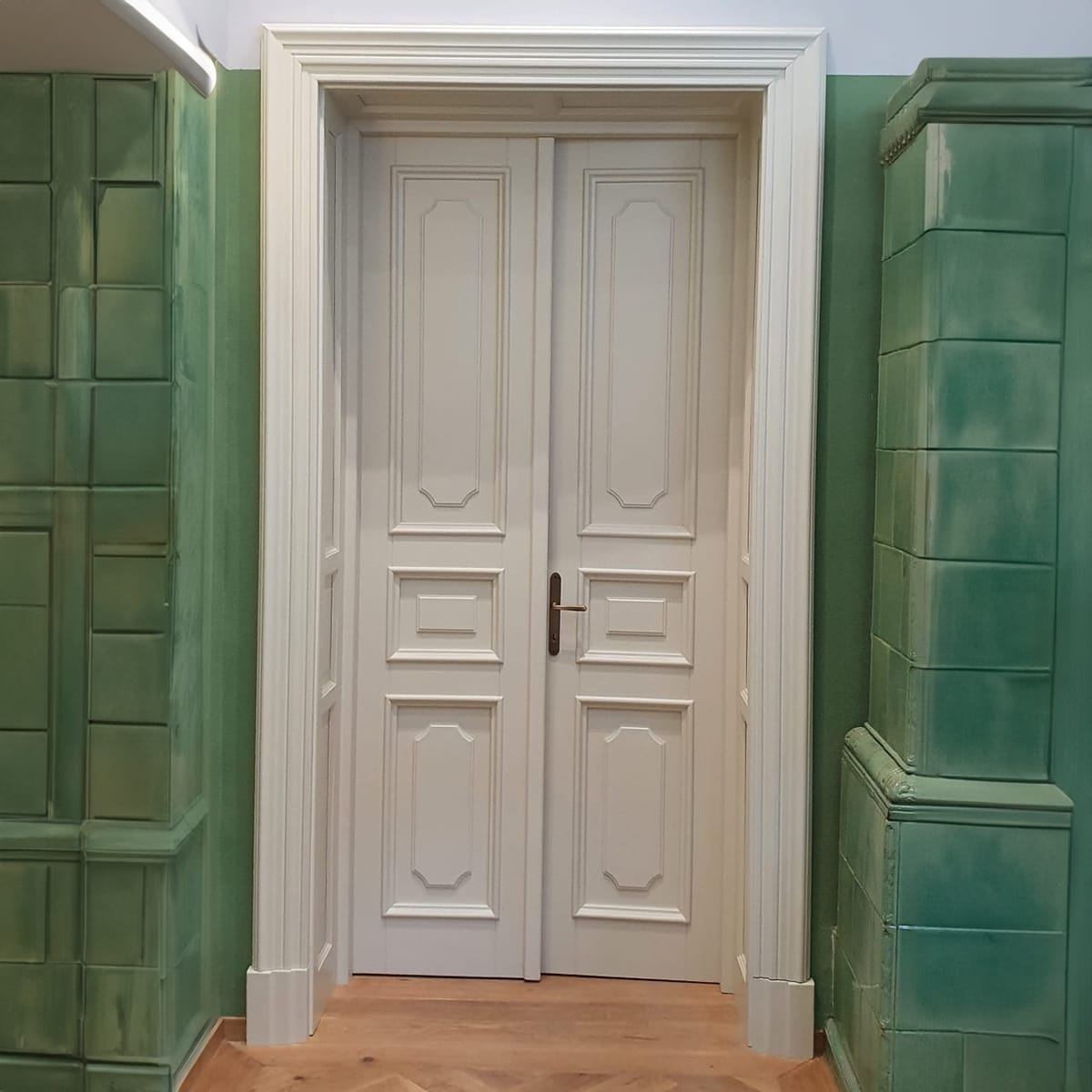 Ansamblu usi in 2 canate, Stejar masiv stratificat model Luxemburg, finisaj alb, captuseli casetate si pervaz profil 16cm latime. Cote model prezentare L140/260cm.