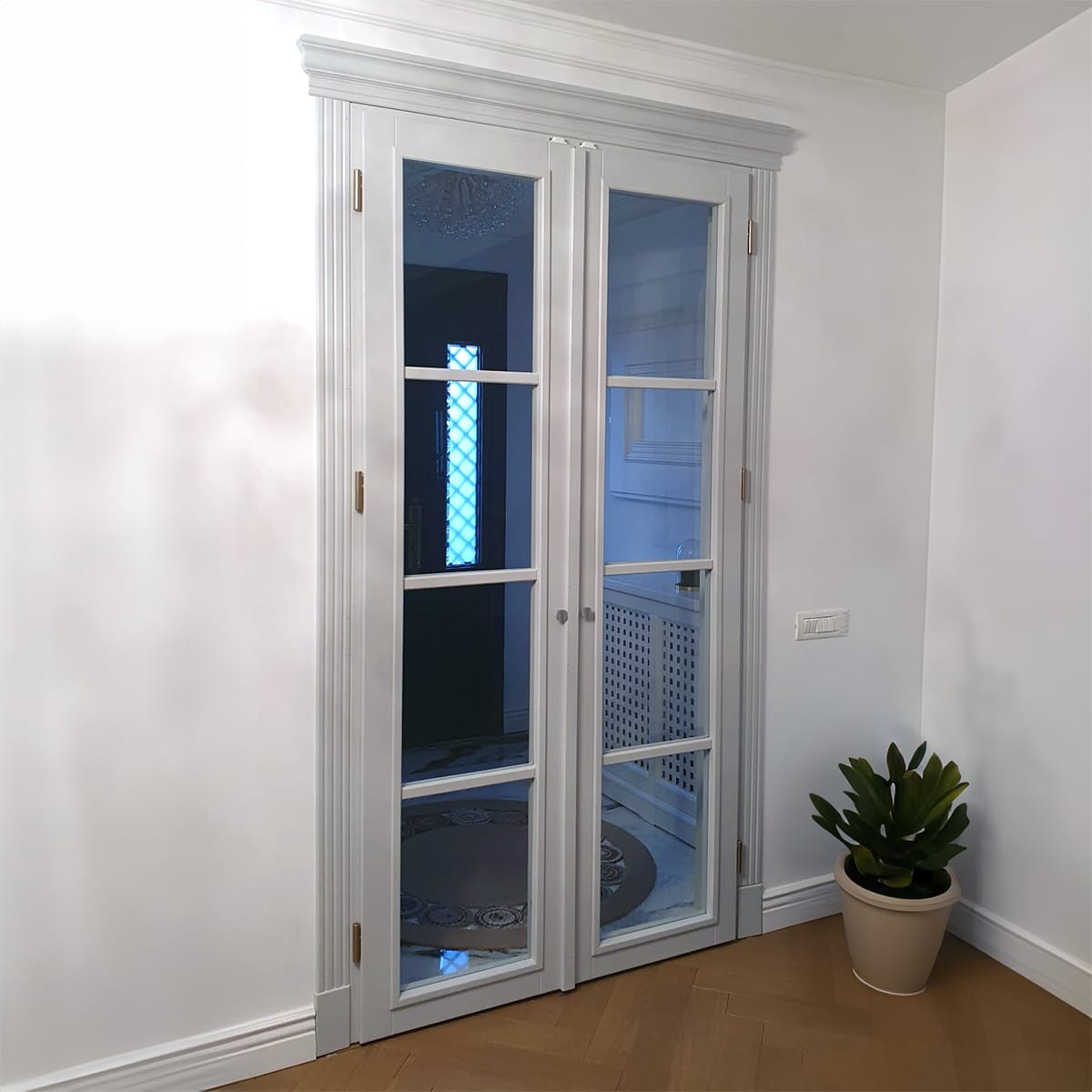 Ansablul 2K reprezentat în imagine este din stejar masiv stratificat, finisaj Gri deschis cu pervaz Capitel cu Cornisa, geam transparent. Model expus cota L120/H210cm.
