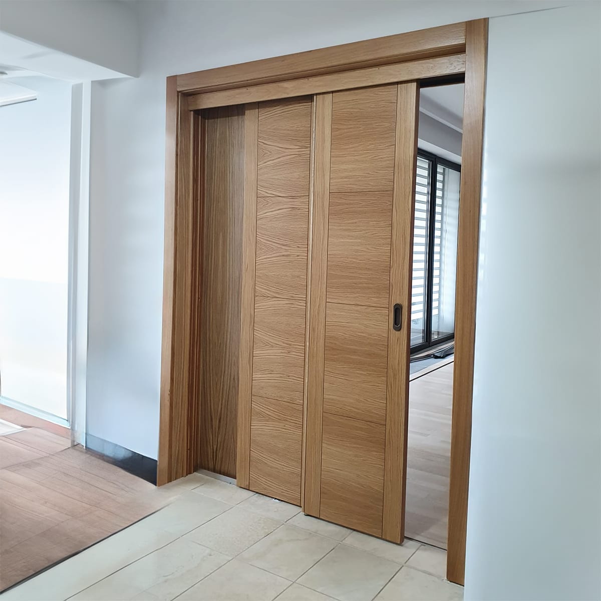 Ansamblu usi in 3 canate glisante suprapuse, Stejar masiv stratificat, finisaj Natur, pevazuri plate Cote model prezentare L170/H210cm.