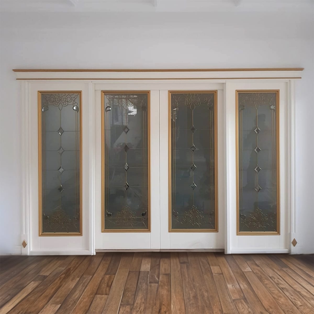 Ansamblu usi in 4 canate cu 2 laterale fixe si 2 usi glisante centrale, Tei masiv stratificat model M05 drept, finisaj alb+auriu, geamuri de tip vitraliu, pevazuri de tip capitel cu cornisa Cote model prezentare L340/H210cm.
