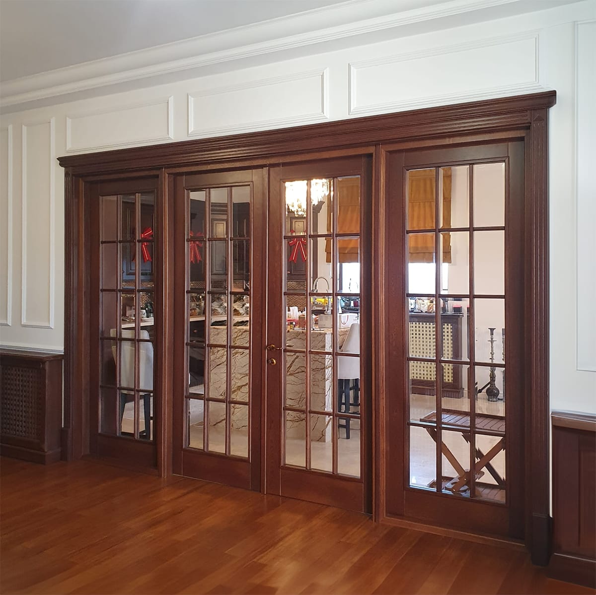 Ansablul 4K reprezentat în imagine este din stejar masiv stratificat, finisaj Noce Scuro cu pervaz Capitel Cornisa clasic si geamuri fasetate Model expus cota L360/H230cm.