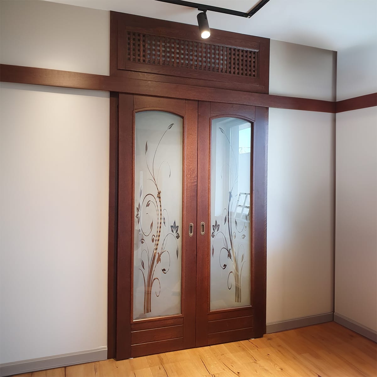 Ansamblu usi glisante, stejar masiv stratificat, finisaj Nuc, geamuri cu model din sablat alb. Cota gol zid L150/H210cm.