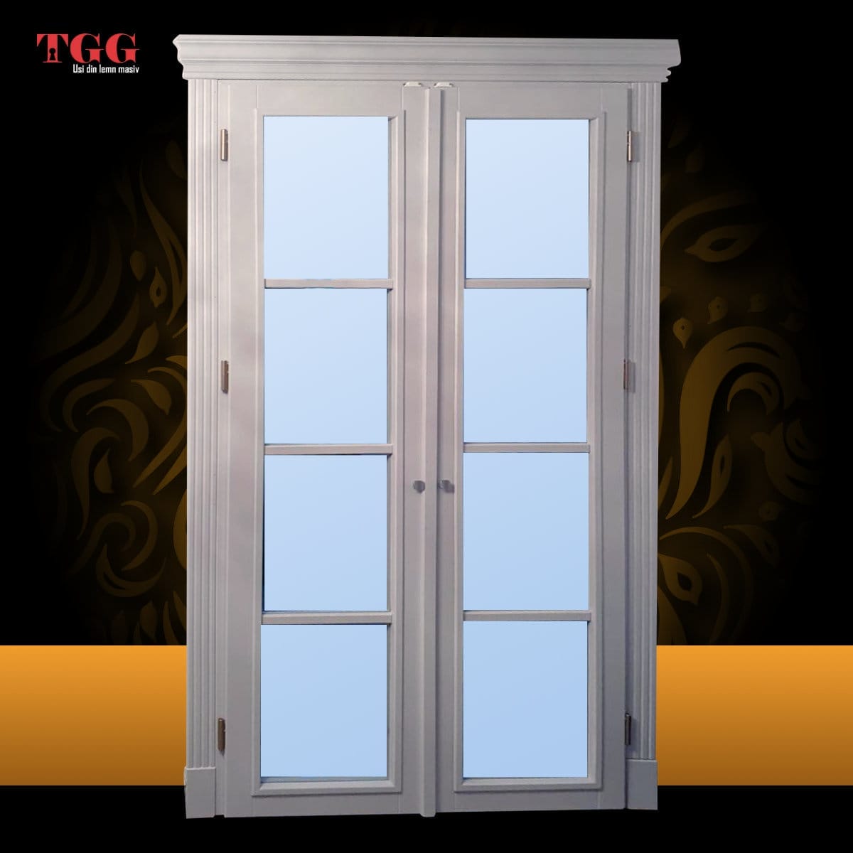 Usa interioara dubla reprezentata în imagine este din stejar masiv stratificat , finisaj alb pervaz Capitel Cornisa.