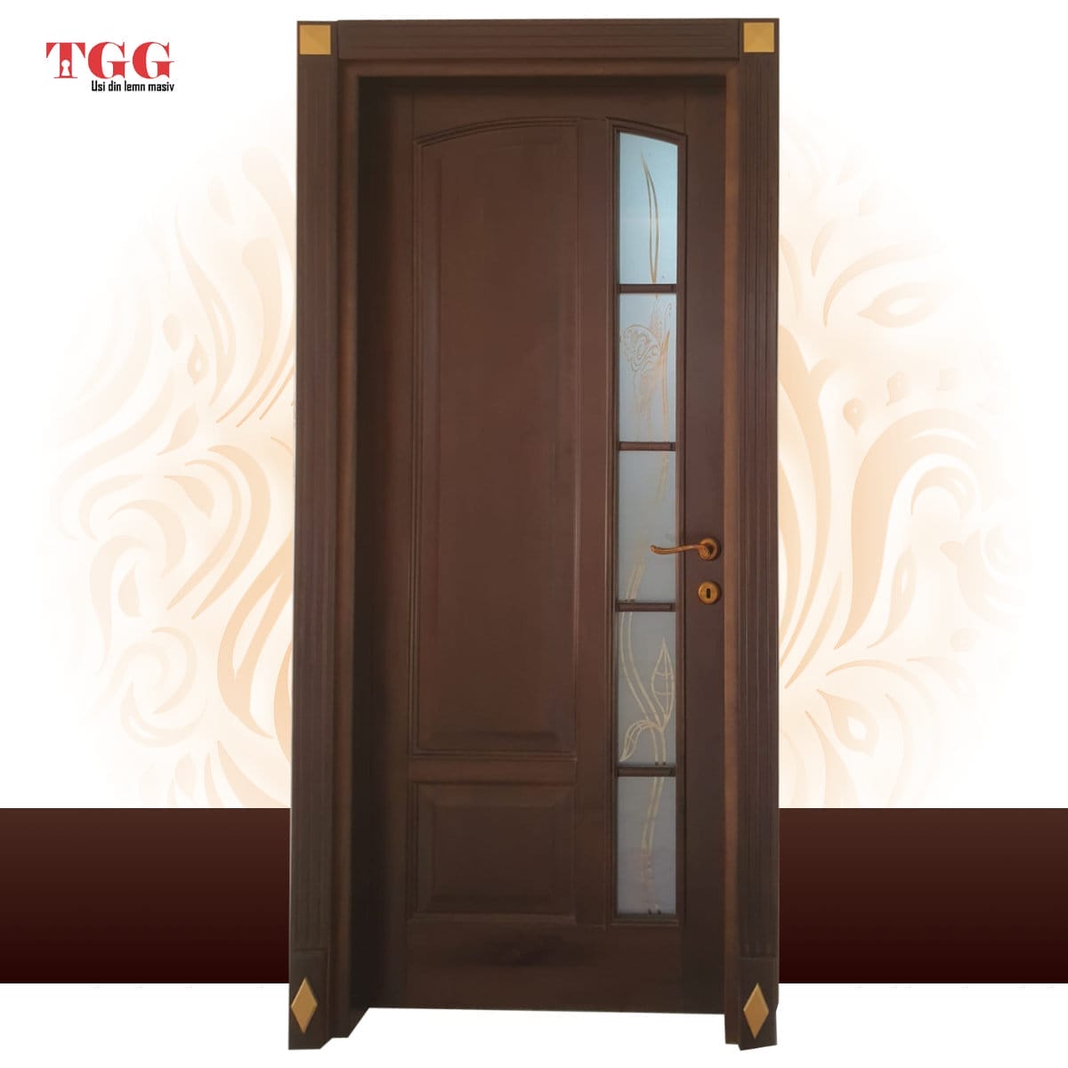 Usa interioara reprezentata în imagine este din stejar masiv stratificat , finisaj ncw, pervaz capitel cu decor auriu