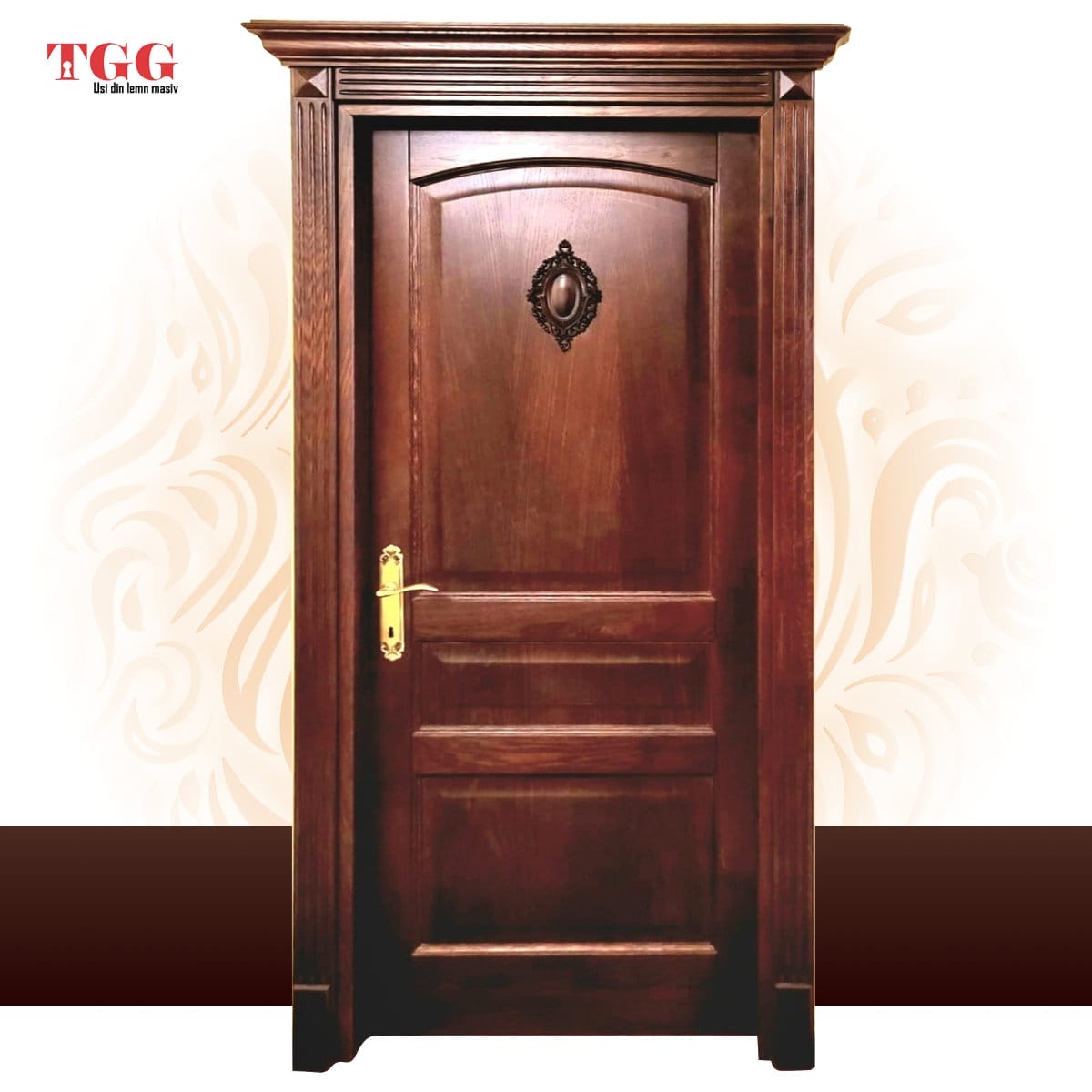 Ușă stejar masiv stratificat finisaj nuc cu pervaz capitel cornisa, ISM-016CC ROTUND
