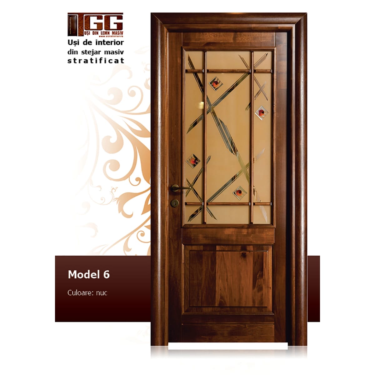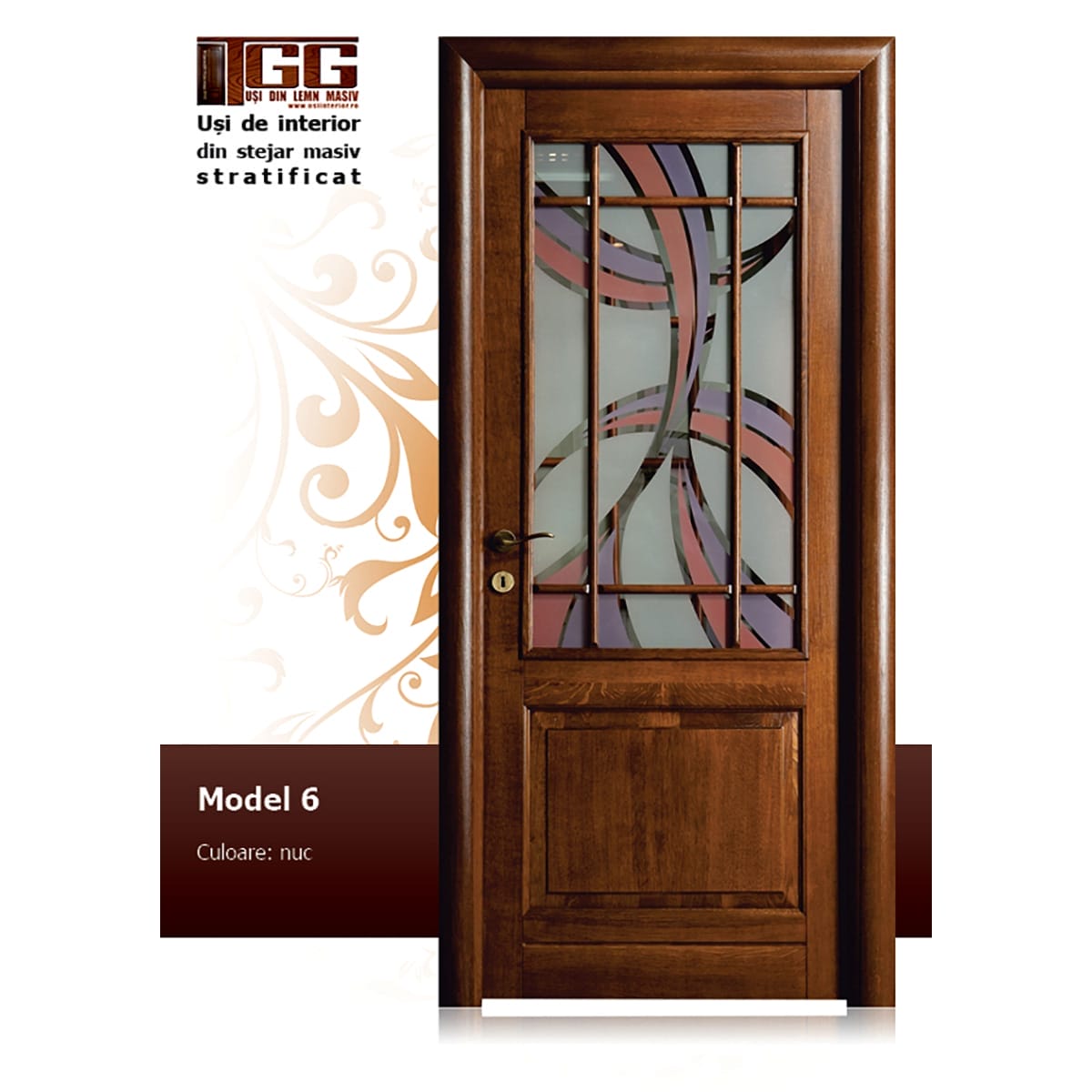 Usa de interior reprezentata in imagine este din stejar masiv stratificat si are culoarea NUC cu 2/3 geam si 9 decupaje in partea superioara.