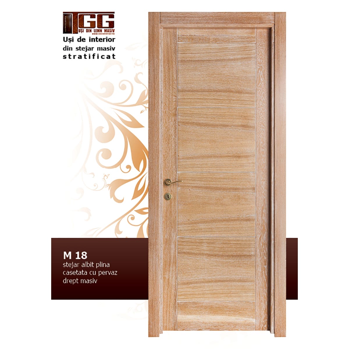 Usa interioara reprezentata în imagine este din stejar masiv stratificat cu pervaz drept masiv, finisaj stejar albit, plina casetata. Poate fi executata in diferite nuante de patina.