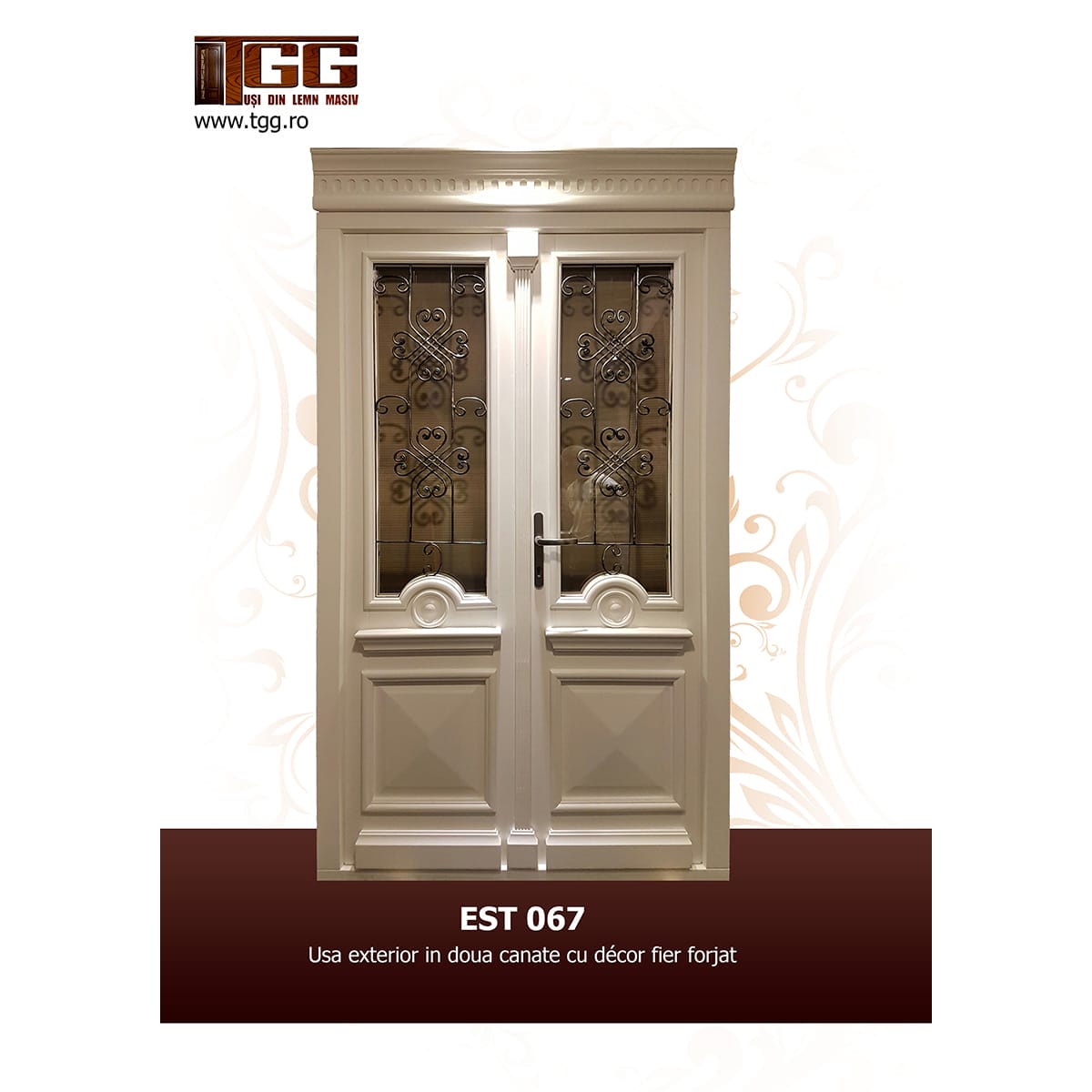 Usa exterioara reprezentata in imagine este din stejar triplustratificat in doua canate egale, geam alb mat cu decor fier forjat, culoare alb, recomandata pentru intrare in casa/vila avand suficienta grosime pentru a asigura rupere termica necesara unei expuneri directe la exterior.