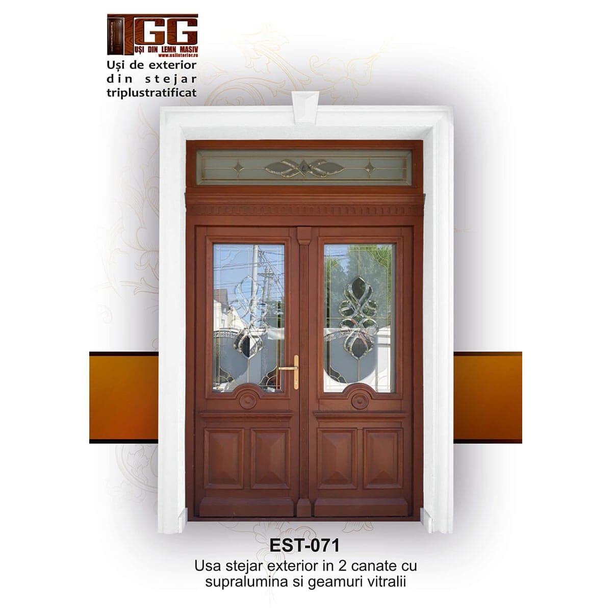 Usa exterioara reprezentata in imagine este din stejar triplu-stratificat si are finisaj stejar-auriu, usa in 2 canate cu supralumina, geam vitraliu, iar ca utilizare este recomandata pentru intrare in casa/vila avand suficienta grosime pentru a asigura rupere termica necesara unei expuneri directe la exterior.
