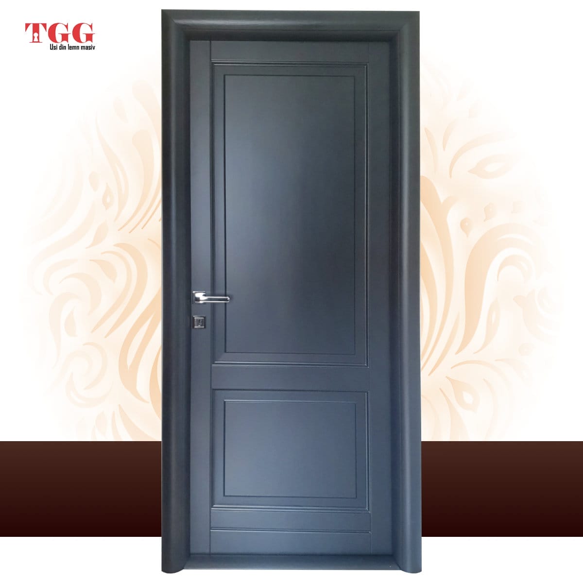 Usa interioara reprezentata în imagine este din tei masiv stratificat, finisaj gri antracit, pervaz rotund